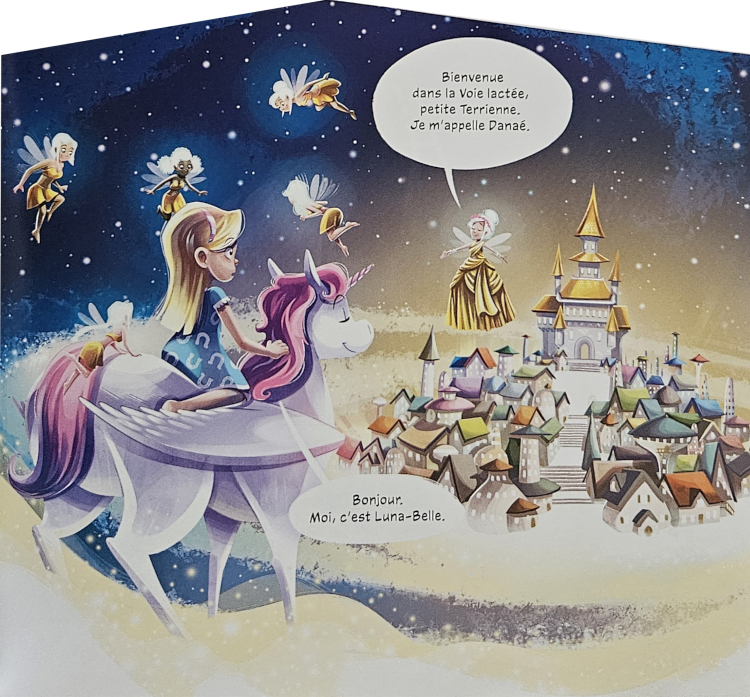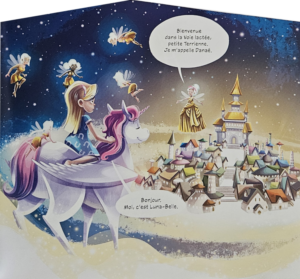 Quatrième de couverture : Le jour de son anniversaire, Luna-Belle voit ENFIN son vœu se réaliser. Du moins, presque… Ce n’est pas un cheval qui atterrit dans sa chambre, mais une LICORNE ! Et la jolie bête a besoin de sa petite humaine pour une mission dans l’espace. Attention ! Prêts ? Volez !