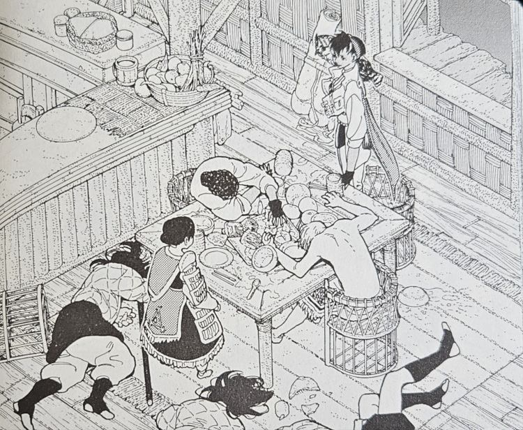 On rencontre également un nouveau personnage qui semble important et qui est surtout bien barré : le prince Bonshen – il a un nom à rallonge, mais on se contentera de ça. Honnêtement, j’ai du mal avec ce personnage. Il est extraverti de fou, il exagère tout, il passe vraiment pour un bouffon. Mais il a un secret qui le rend intéressant.